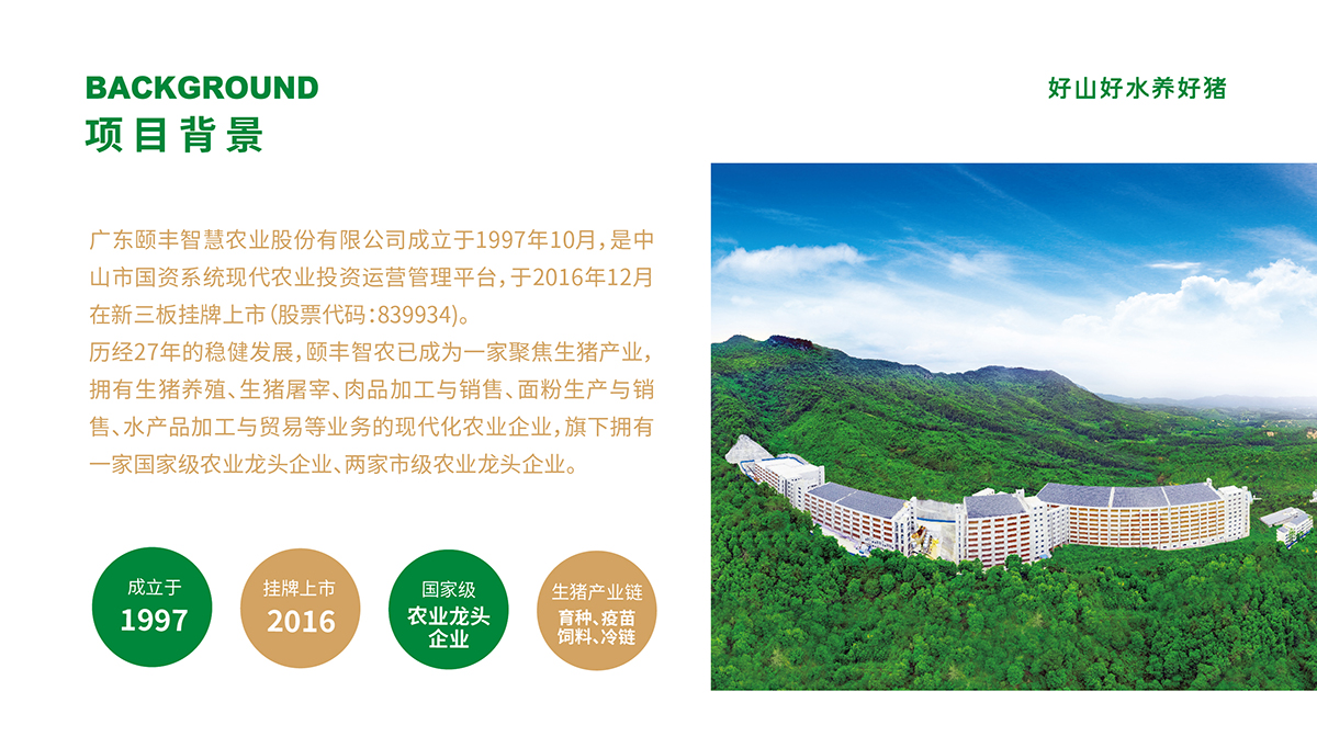 广东颐丰智慧农业股份有限公司成立于1997年10月,是中山市国资委旗下中山兴中集团有限公司现代农业投资运营管理平台,于2016年12月在新三板挂牌上市(股票代码:839934)。
