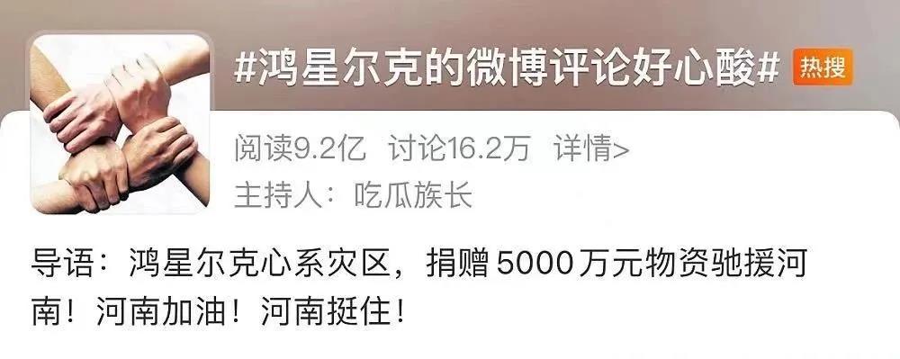 7月21日,鸿星尔克实业有限公司为灾区捐了5000万物资。随后,微博话题“鸿星尔克的微博评论好心酸”登上微博热搜第一,随后鸿星尔克的直播间持续被挤爆,平均每10个国人中就有一个光顾过鸿星尔克的直播间,网友纷纷“野性消费”。