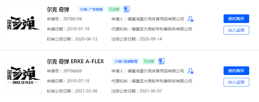 除品牌名及logo外,TO BE NO.1 等令人熟知的广告语也同时注册为商标保护,而在2019年推出的明星产品-尔克奇弹跑鞋,也在25类-服装鞋帽和35类-广告销售分类上做好了商标保护。