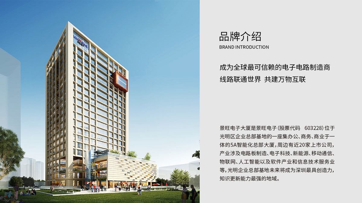 景旺电子创立于1993年,上交所主板上市(股票代码:603228),是全球领先的印制电路板及高端电子材料研发、生产和销售的国家高新技术企业。我们在国内拥有广东深圳、广东龙川、江西吉水、珠海金湾、珠海富山5大生产基地,共11个工厂,全球超过15,000名员工。